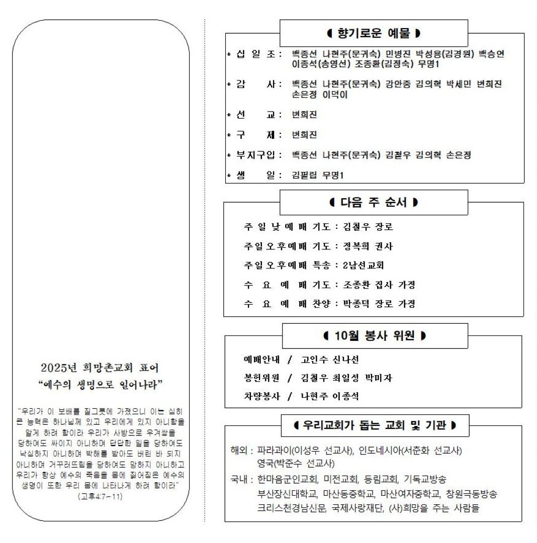 | 이전글 | 2025년 10월12일 주보 | 김철우 | 2025.10.16 | 0 | 46 |