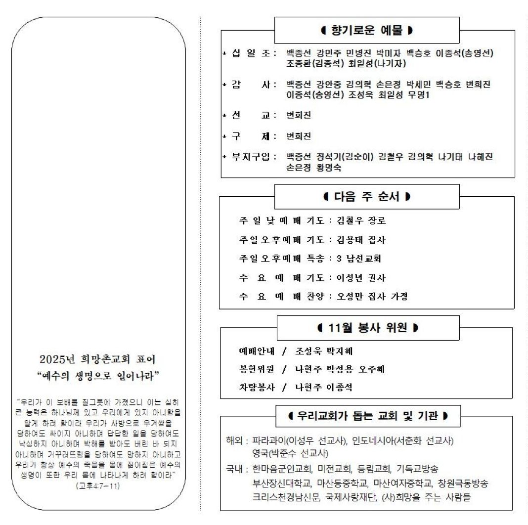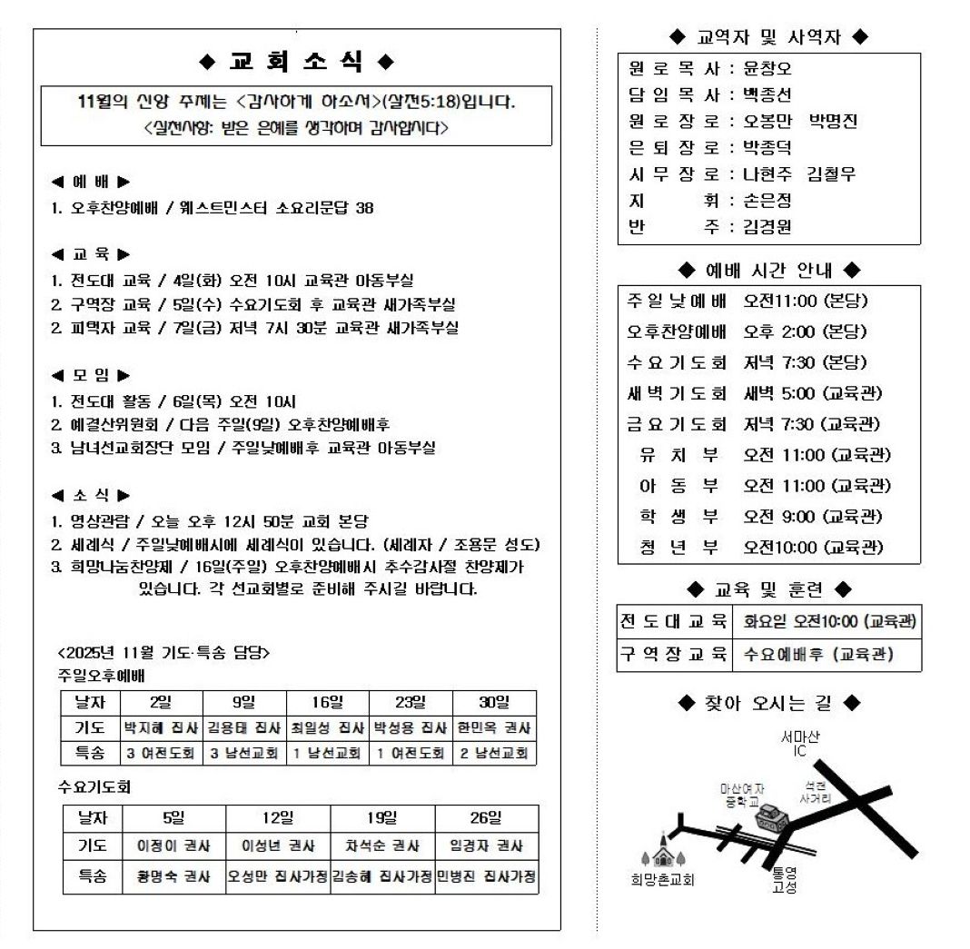| 이전글 | 2025년 11월 9일 주보 | 김철우 | 2025.11.09 | 0 | 23 |