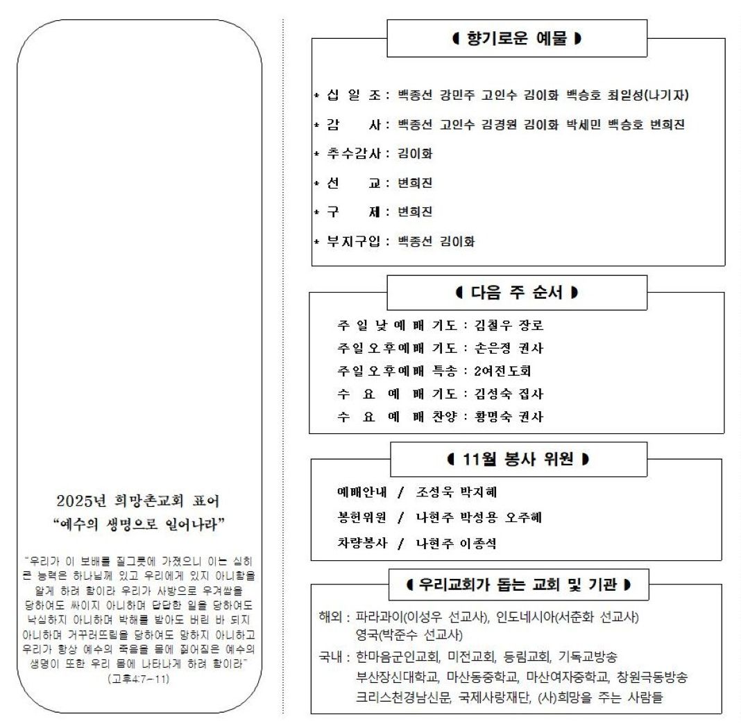 | 다음글 | 2025년 11월23일 주보 | 김철우 | 2025.11.23 | 0 | 14 |