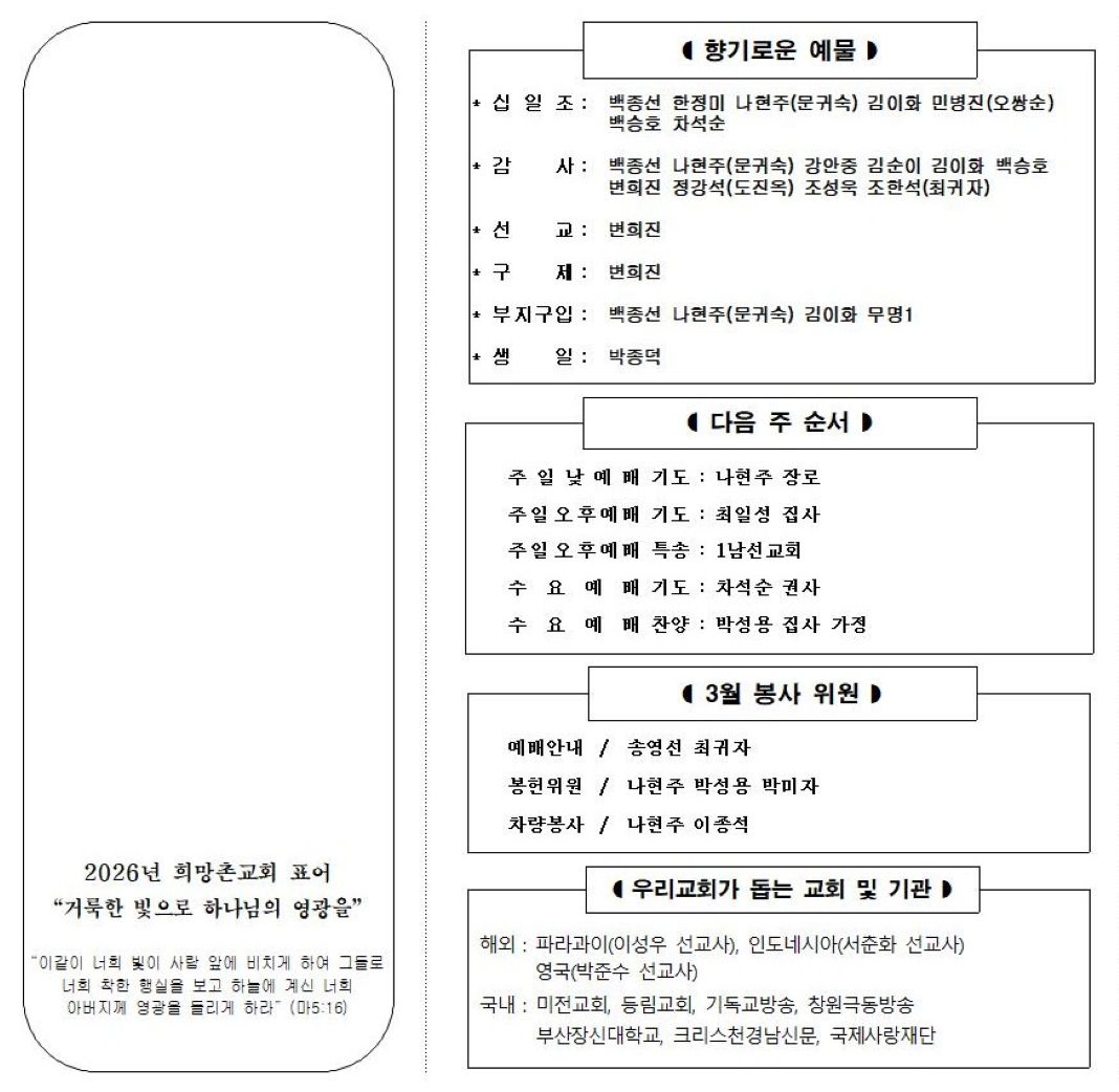 | 다음글 | 2026년 2월 1일 주보 | 김철우 | 2026.02.22 | 0 | 39 |
