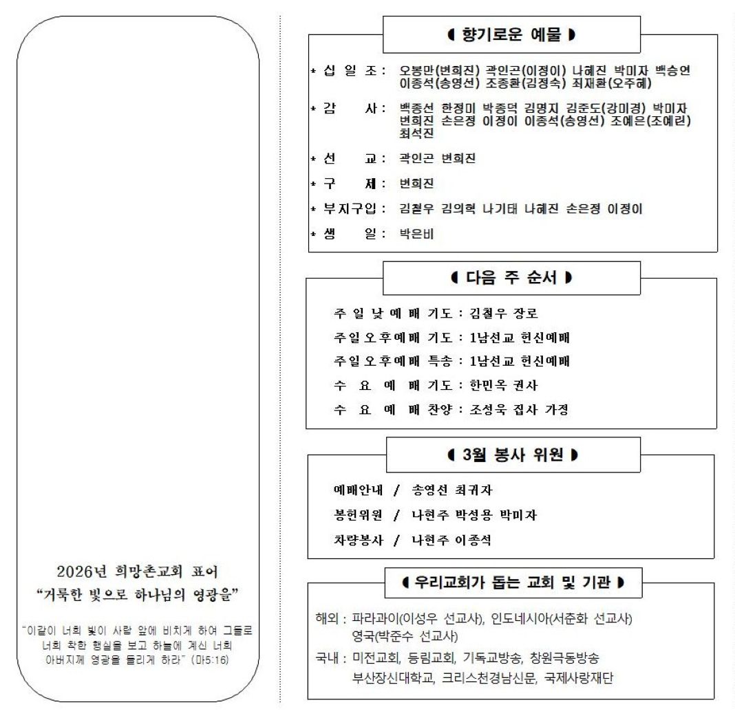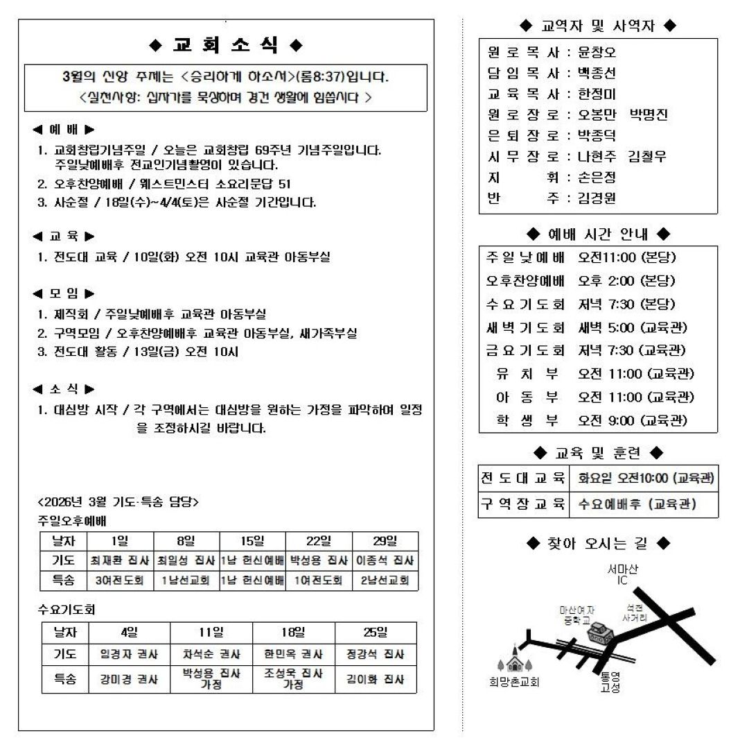 | 이전글 | 2026년 3월 16일 주보 | 김철우 | 2026.03.15 | 0 | 26 |